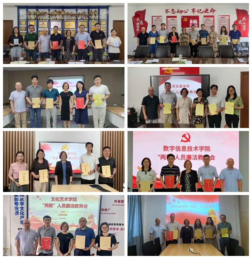 开展个性化的廉洁教育。6月9日至22日,纪委书记朱利萍带领全体纪委办成员深入九个二级学院,逐一开展“两新”人员个性化廉政谈话。在与各学院对接梳理廉洁风险的基础上,朱书记对各学院新一届领导班子成员提出了5点要求:一是要切实规范二级学院决策机制,严格落实党政联席会议和党总支会议议事规则,站稳师生立场,公平公正、科学规范决策;二是要切实防范廉洁风险,实训基地建设、招标采购、项目建设等均要合法合规;三要强化师德师风建设,严守课堂纪律和学术规范;四要坚守意识形态阵地,教育引导师生自始至终讲政治,公开言论守规矩。对新入职教师提出了严格落实习近平总书记提出的“三个传播者”“三个塑造者”“四个引路人”“四个相统一”的要求,希望人人争当“四有好老师”。学院领导班子成员在表态发言中均表示纪委的提醒很及时、很到位,表示在今后的工作中将始终做到讲政治、防风险、守纪律。