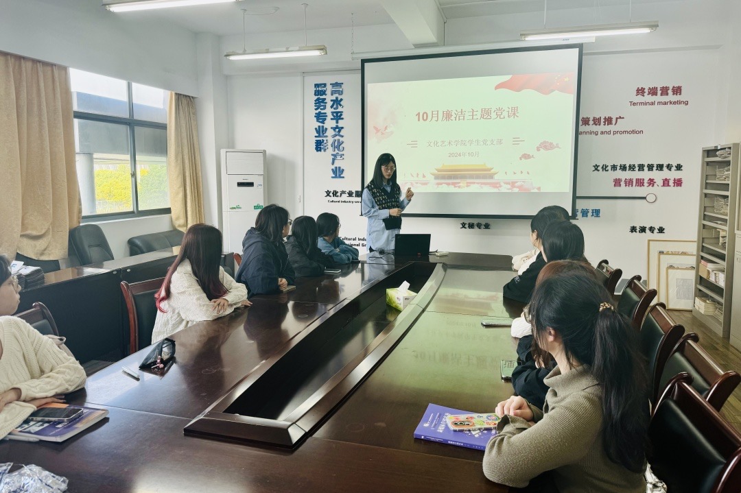 为打造廉洁清正新风貌,促进廉洁教育入心入脑入行,近日,文化艺术学院学生党支部开展10月主题党日活动暨2024级新生廉洁修身主题教育系列活动。学生支部始终不渝地将廉洁文化教育融合于学生学习生活之中,自入学伊始,贯穿培养全过程,直至毕业,全方位提升学生的职业道德素养与廉洁自律意识。