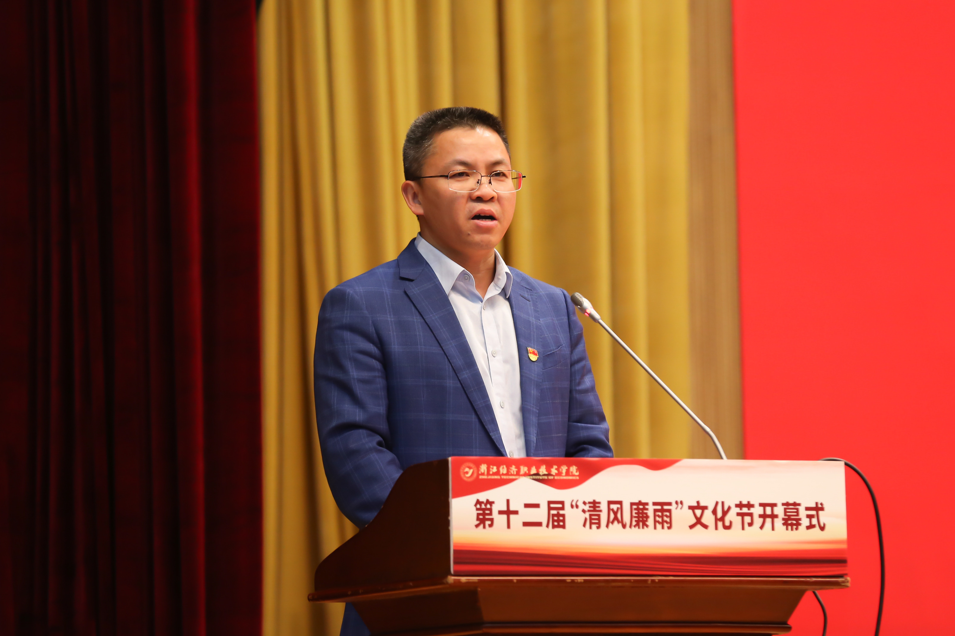 学校党委副书记、校长柯孔林致开幕词并宣布文化节开幕。柯校长他对文化节举办提出三点希望,一要锚定“立德树人”根本,在固本培元中筑牢清廉根基。要把推进廉洁文化建设与学习宣传贯彻党的二十届四中全会关于全面从严治党的新部署新要求相结合,把廉洁教育融入校园文化和师德师风建设,不断深化清廉学校建设,持续擦亮学校高质量发展的清廉底色。二要立足“经院特色”优势,在守正创新中丰富廉洁内涵。要结合学校专业特色,打造更多兼具思想性、艺术性和专业性的廉洁文化作品,创新传播方式,让廉洁文化浸润课堂、渗透校园,不断增强其吸引力、感染力与说服力,彰显清廉之美、放大清廉之效。三要聚焦“全域协同”目标,在行稳致远中构建廉洁格局。要充分发挥廉洁文化的教育、引领和浸润作用,强化“抓发展必须抓清廉”“管业务必须管清廉”理念,不断总结可复制、可推广的特色经验与创新做法,激活清廉学院、清廉部门、清廉支部等最小清廉单元建设动能,推动“清廉经院”建设向纵深发展、整体跃升,为推动学校高质量发展提供坚强保障。